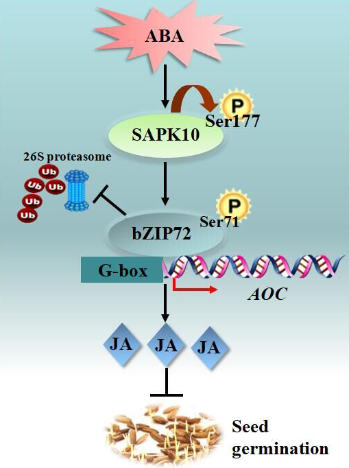 研究人员鉴定和证实了ABA信号途径关键因子SnRK2类激酶SAPK10磷酸化修饰自身的Ser177位点并增强其活性,进而磷酸化修饰下游的bZIP转录因子家族成员bZIP72的Ser71位点。 进一步研究表明,磷酸化修饰增强了bZIP72结合JA合成途径关键基因AOC的能力,并促进后者的转录,从而提高体内的JA水平并抑制种子萌发。此外,外施JA合成抑制剂可缓解种子萌发对ABA的敏感性。综上,该研究揭示了ABA通过促进JA合成进而负调控种子萌发的新机制,为改良水稻穗发芽抗性提供了重要的理论依据。