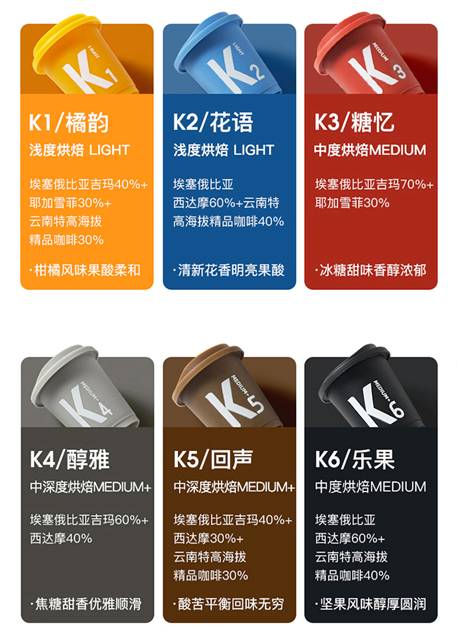 卡尔蓝芝的冷萃系列,提供了六种不同的咖啡风味。K1橘韵:柑橘风味果酸柔和,k2花语:清新花香明亮果酸,k3糖忆:冰糖甜味香醇浓郁,k4醇雅:焦糖甜香优雅顺滑,k5回声:酸苦平衡回味无穷,k6乐果:坚果风味醇厚圆润。K1-K6的6种不同的口味和不同的烘焙程度旨在满足年轻群体多样的需求。卡尔蓝芝在追求咖啡品质的基础上,也同样关注健康的生活方式。所以卡尔蓝芝全部配料只有阿拉比卡咖啡粉。配方零添加,符合当下的健康潮流,低卡、低热量、燃脂减脂。