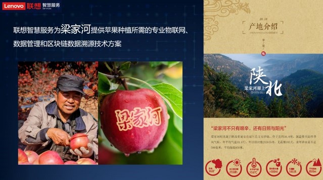 近年来,联想一直致力于助力各行业智能化转型升级,在关乎“民生大计”的农业方面,已经有了多个实践案例。目前,联想已经为梁家河的苹果产业打造了一套完整的智慧农业解决方案,通过大数据、区块链溯源以及IoT等技术支持,可以有效整合农事生产、农资管理、销售渠道、订单匹配等动态数据及苹果种植、生产等数据,实现对当地苹果产业的综合服务和统一监管。在这套方案的加持下,消费者仅通过扫二维码,就能实现对每一个苹果的溯源。