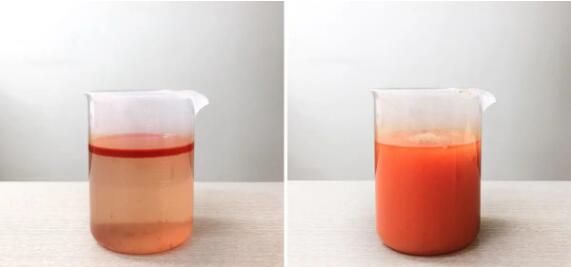 ▲ 图片:(左)水中倒入麻辣油后水油分离出现油层 、(右)倒入磷虾油后油脂在水中被溶解
