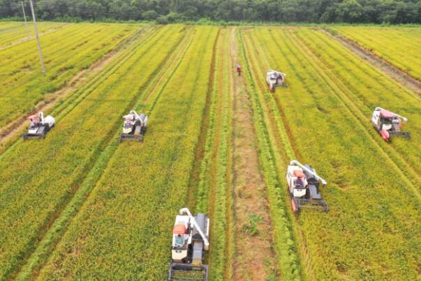 2020年7月27日,浙江省温岭市箬横镇种粮大户朱齐军组织6台收割机抢收早稻。当天,朱齐军种植的1500早稻全面开机收割。