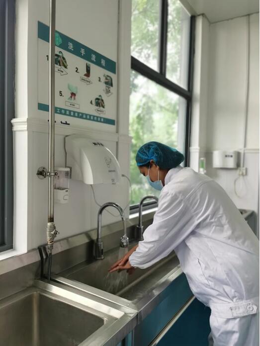 4. 洗手标准:每次更衣进入下一区域前需要洗手。洗手时需使用洗手液后再用水冲洗,双手互搓至手心手臂无滑腻感为止,然后在干手器下烘干。