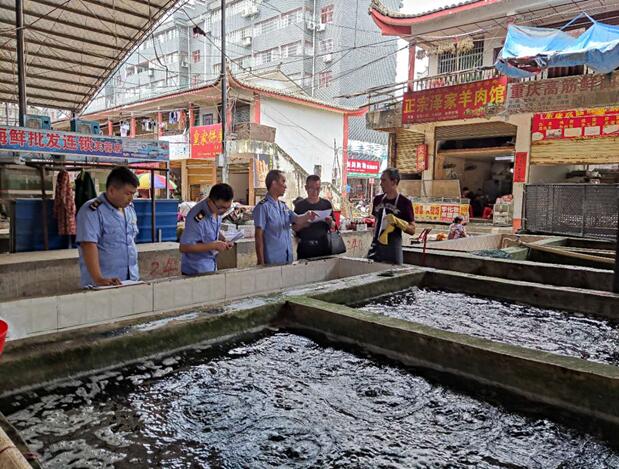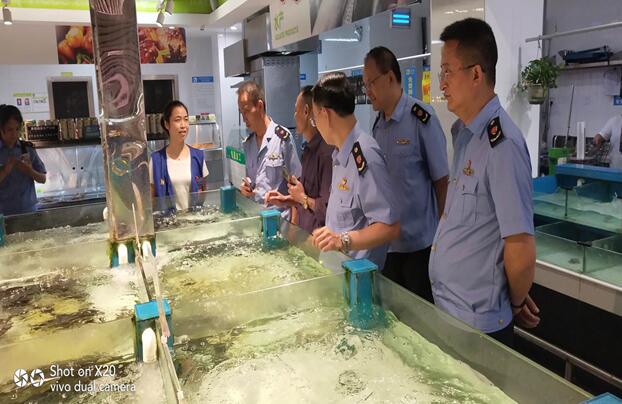 图为彭武双副局长带领执法人员对某超市经营的水产品经行检查