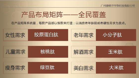 自进入大健康市场以来,益品达健始终秉承“打造民族健康肽品牌,树立健康行业新标杆”这一展望,不吹嘘、不浮夸,脚踏实地做好产品、好品牌。纵观益品达健三款产品不难发现,每一款产品针对的人群和硬性需求都不同。在产品矩阵系统里,益品达健的每款产品都以爆款打造,以消费者年龄和硬性需求为卖点,不断实现全线产品“全民覆盖”的目标。