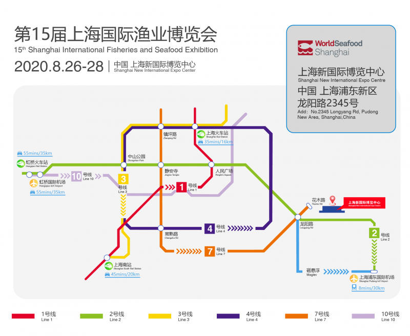 乘坐地铁2号线—龙阳路站下,乘坐展馆巴士到达