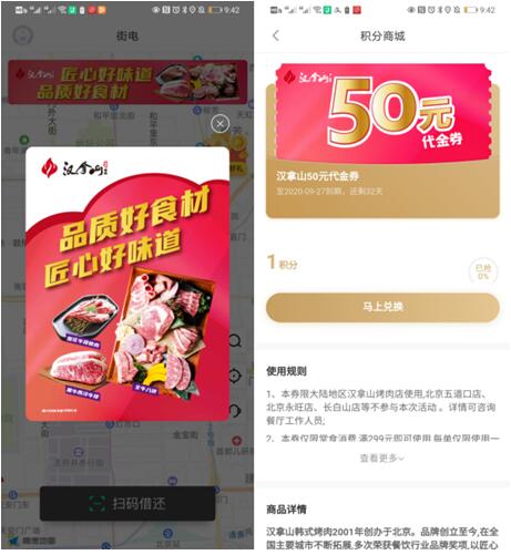 街电此次与汉拿山公司的深度合作,正是基于广大消费者对烤肉的热爱,充分整合街电线上流量资源和技术优势,为用户精准推送专属福利。8月27 日至9月1日期间,消费者通过街电App租借共享充电宝,均有机会领取汉拿山烤肉50元代金券,在汉拿山烤肉全国近百家门店消费满一定金额即可享受抵扣。