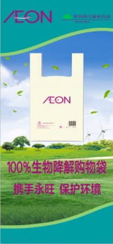 永旺于2008年在广东地区率先在店铺正式导入全生物降解购物袋。之后由广东自南向北扩大到全国区域。经过多年的努力,目前永旺全国范围77家超市中已有67家店铺导入全生物降解购物袋,计划年内店铺100%导入。截至2019年,永旺顾客已累计使用115,687万个全生物降解购物袋,可削减二氧化碳排放2,752KG。