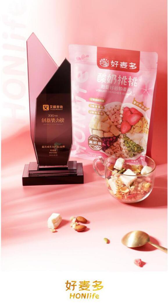 值得一提的是,HONlife好麦多品牌引领创新工艺,好麦多奇亚籽酸奶麦片系列深受时下年轻人喜爱,其中酸奶桃桃麦片在行业中首先采用真果肉浸润技术,在不加防腐剂和色素的情况下仍可以长期锁鲜保持良好口感,桂花胶原蛋白麦片采取鲜花冷萃技术以及胶原智喷方式,使得口感和营养兼备,全系列使用非油炸健康工艺,细分品类行业领先。