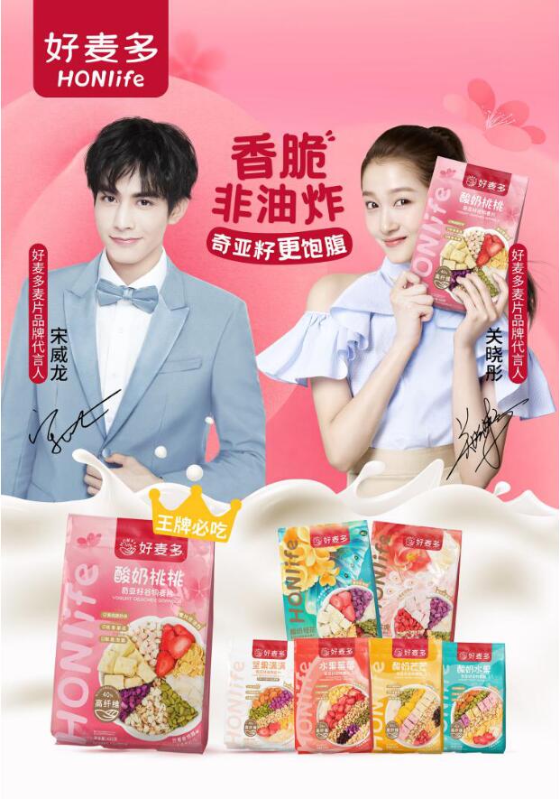 好麦多HONlife是中国时尚健康食品中的龙头品牌,是中国好麦片HON金标准开创者,为国人打造好健康(Healthy)、好食材(Original)、好美味(Nice)的生活方式。好麦多品牌由关晓彤和宋威龙代言,香脆非油炸,先进健康工艺,旗下奇亚籽谷物麦片系列深受国人的喜爱,其中酸奶桃桃、桂花胶原蛋白等创新谷物产品长期稳居领导地位。