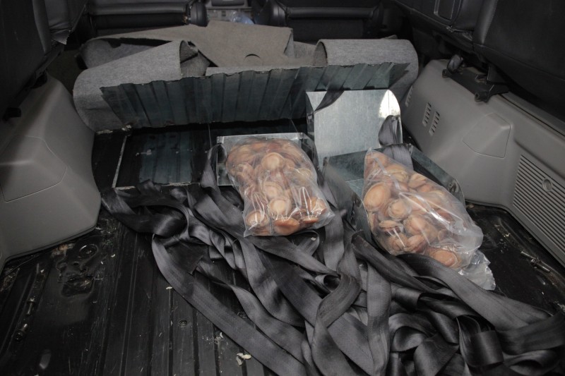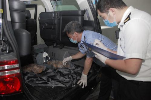 当日10时许,港珠澳大桥海关关员在入境客车通道对一辆粤澳两地牌客车进行顶照式查验时,发现机检图像异常,遂对司机李某进行问询。李某态度坚决,拒不承认藏匿事实。当值关员对该车再次实施重点查验,发现车体有多处改装痕迹。经会同海关缉私部门联合执法,海关查实李某驾驶的跨境车辆经过专业改装,内设有3个暗格。司机李某不得不承认违法事实,并主动拆开车体改装暗格,掏出其间藏匿的干鲍鱼约40公斤。该宗案件初步预估案值约20万元。目前,该案已移交缉私部门作进一步处理。