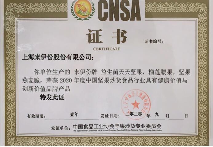 本届“中国坚果健康周”活动,来伊份“鲜”声夺人,接连斩获“2019年度全国坚果炒货行业综合经济(品牌)20强会员企业”、“2019年度全国坚果炒货行业优秀经销商会员企业”、“全国坚果炒货食品行业科学技术进步奖”等多项行业大奖,上海来伊份股份有限公司联合创始人兼总裁郁瑞芬女士荣获“2005-2020年中国坚果炒货行业杰出贡献女家”、副总裁王芳荣获“2005-2020年中国坚果炒货行业优秀经理人”等荣誉称号,同时来伊份益生菌天天坚果、榴莲腰果、坚果燕麦脆等三款产品荣登“2020 年度最具健康价值与创新价值产品品牌榜”。