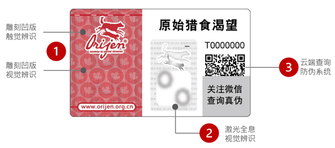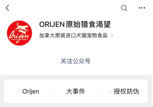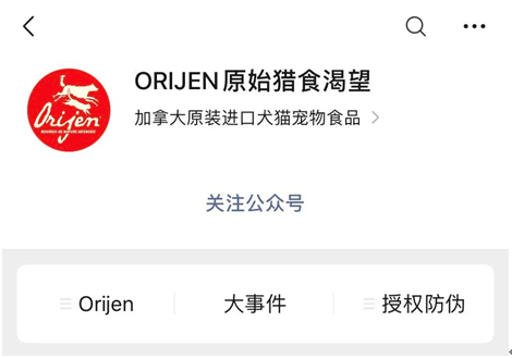 2渴望官方微信公众号【ORIJEN原始猎食渴望(ID:ORIJEN01 )】及官网将作为官方认可的防伪查询渠道入口!