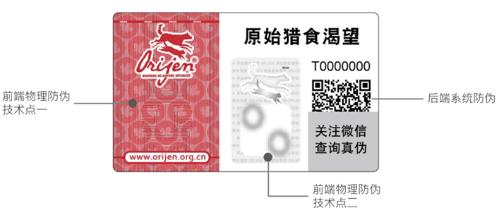 自ORIJEN原始猎食渴望宠物食品来到中国,一直实行双标防伪机制,以便各位爱宠主人可以购买到正品渴望,更好的滋养爱宠。为了尽可能杜绝假冒仿制,ORIJEN原始猎食渴望双标防伪标志也进行了数次升级。
