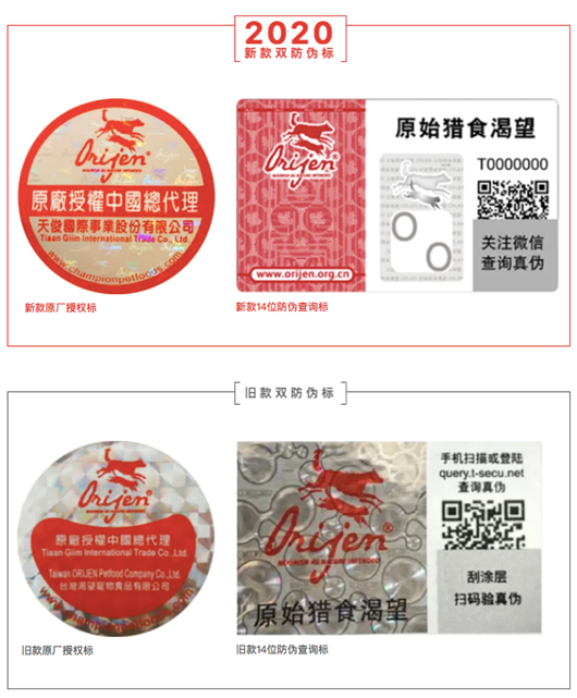 ORIJEN原始猎食渴望全新双防伪标将于2020年7月15日正式投入使用。