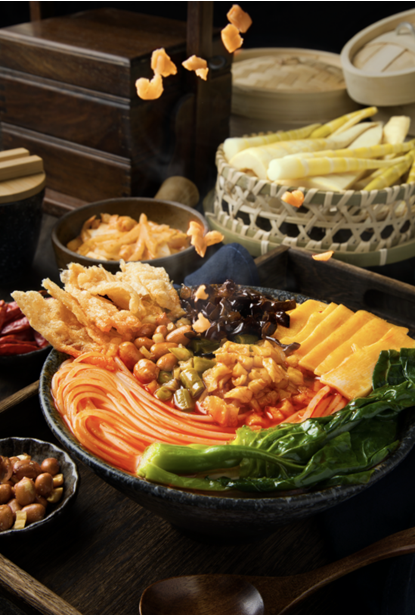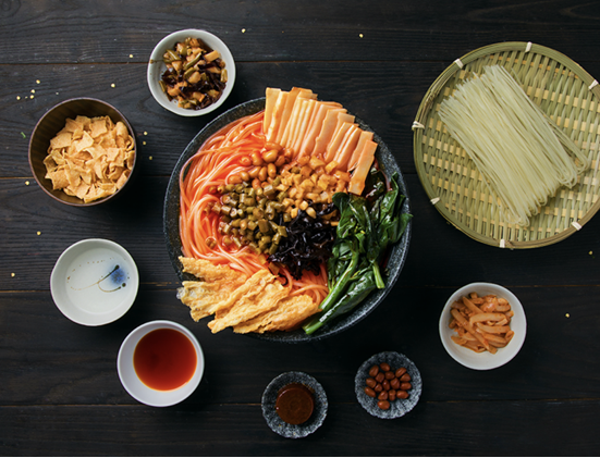 另外,闲物螺蛳粉还配有匠心制作的豪华配料包增添风味。腐竹制作上,精选优质黄豆打磨成浆,传统工艺高温加热后晾制,凝结豆衣捞起晾晒;豆衣成型后切块,再使用一次性食用植物油炸成金黄色;腐竹在粉中泡开后,软而不烂,嚼劲十足。冷油下锅后小火翻炒的花生,每粒都受热均匀,香脆可口。红油料包优选植物油加入紫苏、大蒜、大葱、芹菜熬制,最后再与一定量比例的优质干辣椒粉混合,提香增味,色泽通透,流动性强。每次打开红油料包,鲜美的汤汁瞬即渗透到每一根粉条。