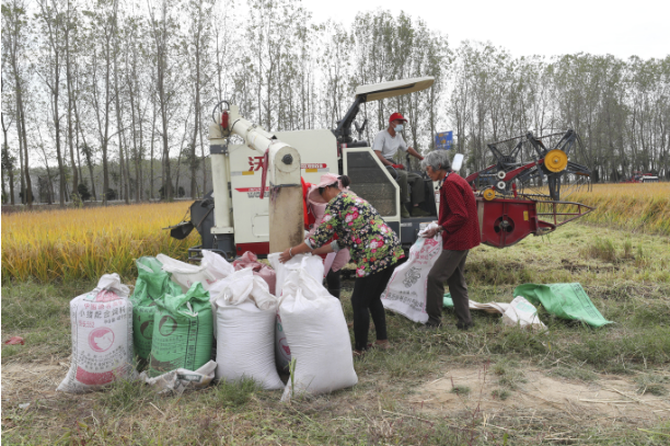 金秋时节,江苏省连云港市赣榆区40多万亩水稻喜获丰收,当地农民抢抓晴好天气,确保水稻颗粒归仓,田间地头一片繁忙景象。