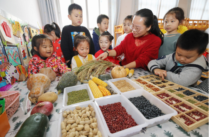 10月16日,江苏连云港市赣榆区实验幼儿园的小朋友们在老师的指导下辨识粮食。