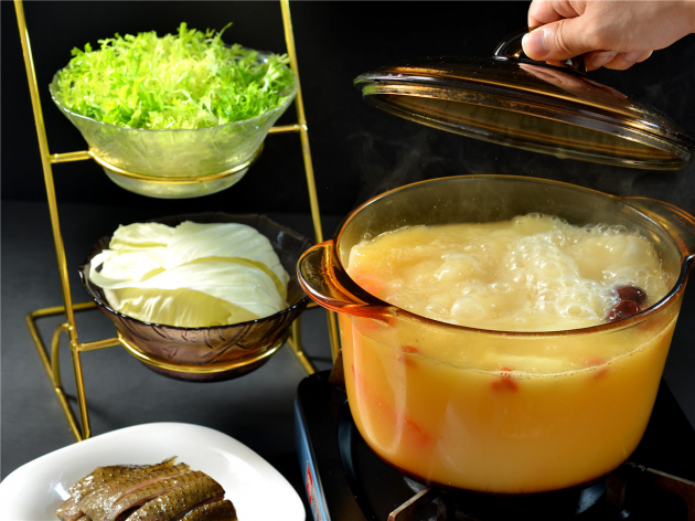 在农夫问道生态能量餐吧有三大镇店招牌菜、六大生态特色菜和八大能量必点菜等广受食客追捧的菜品。具了解最受欢迎的一道菜叫菜篮子1号,汤鲜味美,营养丰富。据服务员介绍,此汤是选用古蔺深山农家老母鸡,加入补气养血的大枣、枸杞等,小火熬制3小时以上,让营养融入汤里。