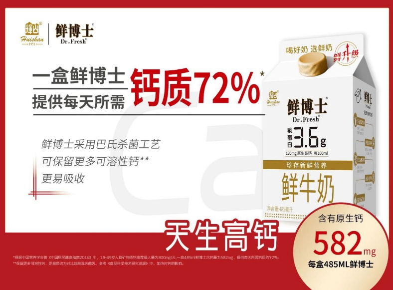 据了解,一盒485ml的辉山鲜博士含钙量高达582mg。据中国营养学会《中国居民膳食指南2016》建议,矿物质钙推荐摄入量为800mg/天,故而一盒辉山鲜博士能解决一天72%的钙质需要,是名副其实的补钙小能手。而且辉山鲜博士采用巴氏杀菌工艺,可保留更多的可溶性钙,更易身体吸收。除此之外,辉山鲜博士还含有免疫球蛋白、乳铁蛋白及多种氨基酸,有助于增强免疫细胞的活力,保护身体的免疫功能,其中,蛋白质多16%,天然乳蛋白高达3.6g/100ml,营养更全面。