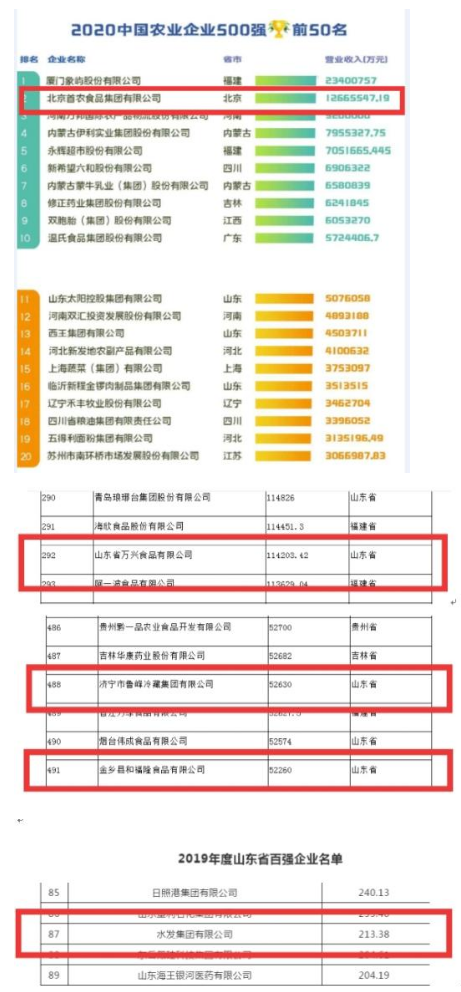 近日,由农民日报社组织评定的2020中国农业企业500强发布,园区入驻企业北京首农集团位列第二名,山东万兴食品、济宁鲁峰集团、金乡和福隆也榜上有名。另外园区招引入驻的山东水发集团也成功上榜2019年度山东省百强企业公示名单。