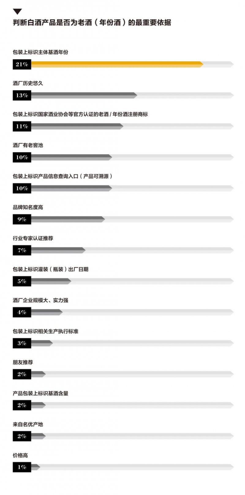 同时,“包装上标识主体基酒年份”(21%)、“酒厂历史悠久”(13%)、“包装上标识国家酒业协会等官方认证的老酒/年份酒注册商标”(11%)是判断产品是否为老酒的三大依据。