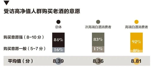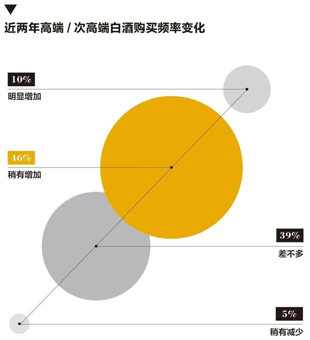 首先,“喝少点,喝好点”成为消费共识。《白皮书》显示,随着消费能力的提升、健康意识的增强,人们对高品质白酒的消费需求与日俱增,“喝少点,喝好点”逐渐成为一种消费共识。56%的受访高净值饮酒人群表示近两年增加了高端/次高端白酒的消费频率,频率明显增加的占比10%。