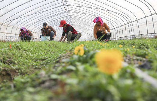 2020年11月7日,江苏省连云港市赣榆区塔山镇一家合作社农民在大棚内除草。