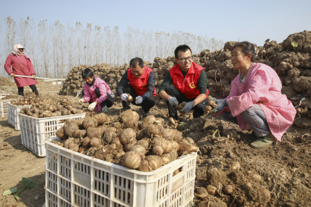 初冬时节,江苏省连云港市赣榆区城头镇仙墩村的芋头种植基地里一片热火朝天的繁忙景象,党员志愿者正与种植户一起分拣芋头准备装车外销。该村今年种植的2000亩芋头大丰收,亩产量3500公斤,均亩效益在1.2万元。