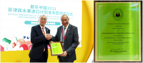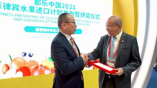 作为进博会三届元老,在今年的进博会上都乐被授予了一份特殊的荣誉。11月7日由菲律宾驻华大使罗马纳先生(Jose Santiago L.Sta. Romana)向都乐中国颁发了“菲律宾对华出口贸易贡献奖”,以表彰都乐中国在过去的几十年中对于菲律宾水果推广所作出的贡献。
