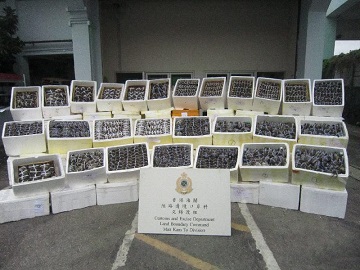香港海关十一月十三日在文锦渡管制站检获约一万三千只怀疑走私大闸蟹及约三吨怀疑走私货物,估计市值共约一百二十万元。案中搜获大闸蟹以数量及重量计算,再打破十月二十九日录得七千七百只的记录,成为有记录以来最大宗的走私大闸蟹案件。图示检获的怀疑走私大闸蟹。
