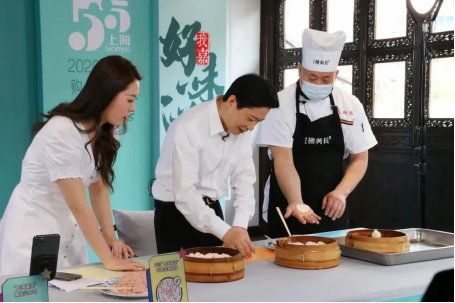 上海“五五购物节”期间,嘉定区委书记陆方舟亲临直播间学习制作长兴楼南翔小笼