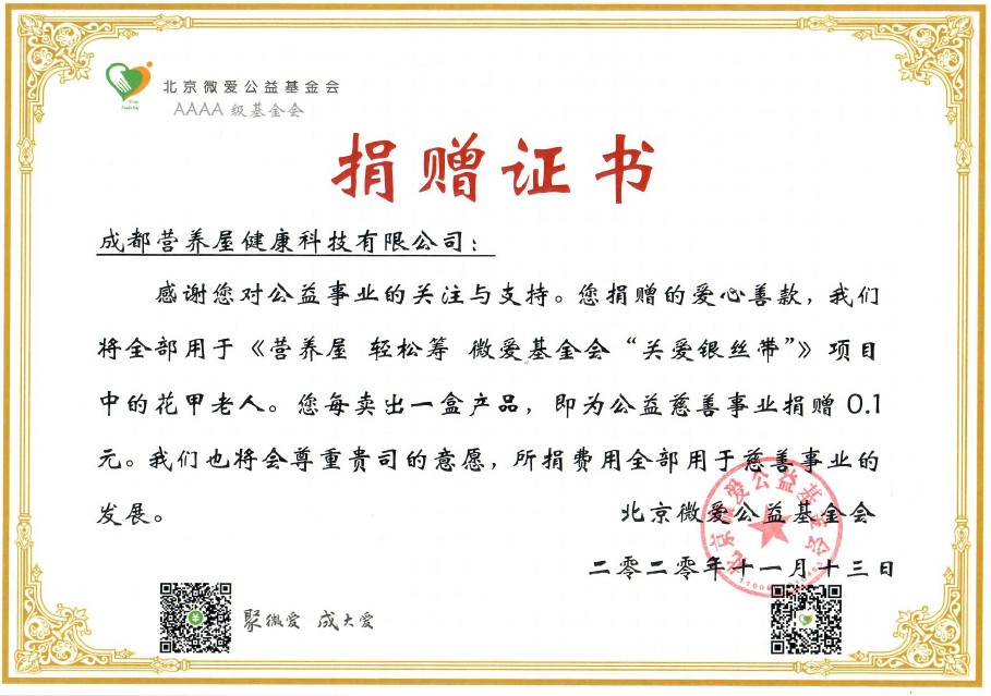 营养屋是一家专注打造适合中国人的天然草本营养品的品牌。为了帮助更多的中老年人,感恩回馈社会,近日营养屋联合北京微爱公益基金会,就爱的1+1“关爱银丝带”项目达成捐赠协议,营养屋每卖出一盒产品即为公益慈善事业捐赠0.1元,用于救助此项目中的花甲老人,彰显企业的社会责任和公益力量。