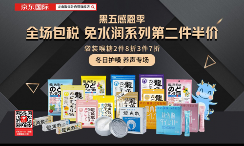 双十一刚过,又临感恩节。日前,日本知名护嗓品牌龙角散在京东龙角散海外旗舰店上线了感恩节专场活动,推出了包括全场包税、第二件半价等感恩福利活动,以回报消费者对其品牌的信任和支持----在刚刚过去的京东11.11全球热爱季中,龙角散一举超越了瑞士莲、费列罗等知名糖巧品牌,占据了进口糖巧产品销量的榜首。