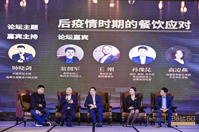 晚宴开始之前,诺莱仕游艇会行政总厨&中国烹饪大师&东方卫视《顶级厨师》等节目总顾问&橄榄中国餐厅大奖召集人帅晓剑先生同四位行业领军人物翁拥军先生、王刚先生、孙豫昆先生及蓝带国际学院大中华区总监商凌燕女士以论坛对话的方式,共同分享了后疫情时期的餐饮应对形式。