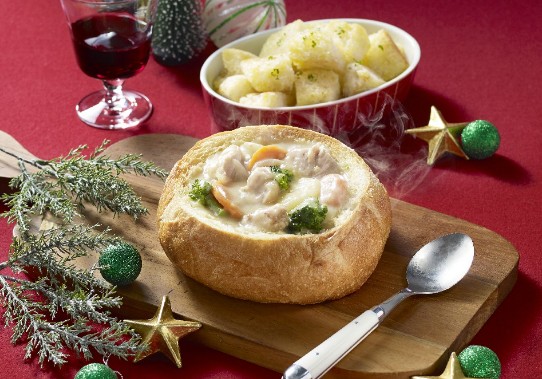 经过上述步骤,一道圣诞奶油浓汤面包碗就做好了~在颜值上,这道菜碾压了大部分汤类,面包的温暖气质和奶油的淡雅白净衬托出一种大道至简的柔美和清新。而在味道上,鸡肉的浓香、蔬菜的清香搭配着奶油的浓郁口感,让人欲罢不能,一口面包,一口炖菜,滋味无穷。