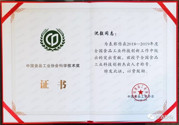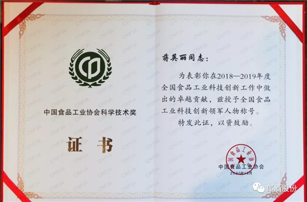 其中,郎酒股份总工程师蒋英丽获“全国食品工业科技创新领军人物”荣誉称号;郎酒股份常务副总工程师沈毅获“全国食品工业科技创新杰出人才”荣誉称号,一家斩下双份荣誉。