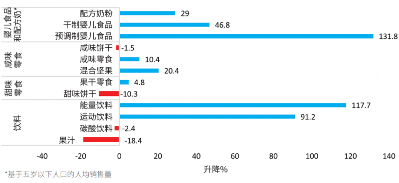 尽管存在一些例外,许多类型的饮料、甜咸味零食、婴儿食品和配方奶粉的销售量都在增长。