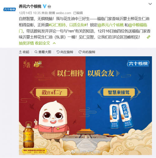 对于食品企业而言,品质是征战消费市场的利器,是每一家企业的必修课。只有做到了好品质,才能俘获消费者,才能获得持续发展的后劲,才能走得长远。12月14日,食品领域佼佼者,养元六个核桃和中粮福临门这两大国民品牌共同亮相,发布话题为#以仁相待,以质会友#的微博互动,并以高品质产品打造“好仁联盟”,同时开启高端产品全国线下巡展,充分展示优质产品、圈粉消费者。