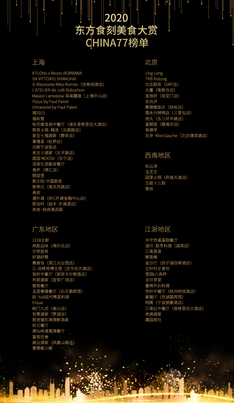 “东方食刻美食盛典”组委会主席、食刻文化董事长郦辉在盛典开场时就特别介绍道:“今年盛典和以往很不同,我们在《China77》和《食刻精选》榜单外,考虑到疫情等综合因素,特别新增了《食刻盐选》、《年度热榜品牌》、《抗疫杰出贡献奖》、《老字号创新品牌》和《跨界餐饮奖》,以此鼓励更多餐饮企业去突破创新,希望看到更多新鲜的餐厅上榜。”
