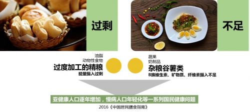 同时,油脂、动物性食物、过度加工的精粮导致能量摄入过剩,而蔬果、奶制品、杂粮谷薯类、B族维生素、矿物质、纤维素等摄入不足。膳食现状整体处于“营养过剩”和“营养不足”的矛盾现状。
