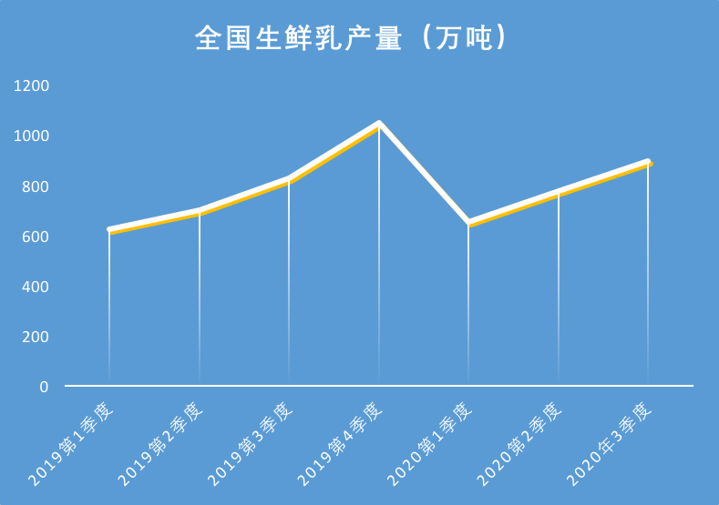 据国家统计局数据显示,2020年前三季度全国牛奶产量2329万吨,比去年同期增加175万吨,增长8.1%。三季度,全国牛奶产量898万吨,环比增加121万吨,增长15.6%,同比增加71万吨,增长8.6%。三季度生鲜乳产量和生产效益稳步回升。