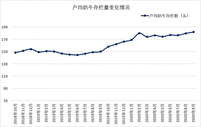 截至2020年三季度末,全国发证生鲜乳收购站所涉及的养殖场场户数量环比增加1.1%,同比减少10.8%;涉及奶牛存栏环比增加3.1%,同比增加7.8%。生鲜乳收购站涉及养殖场户户均存栏环比增加2.0%,同比增加20.8%。