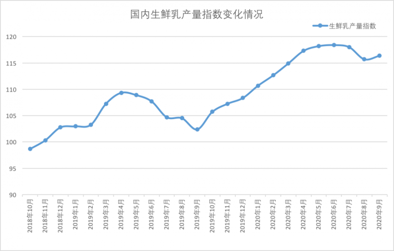 根据农业农村部对全国发证生鲜乳收购站生鲜乳产量跟踪监测,自去年9月份以来,国内生鲜乳产量持续保持增长势头,截至2020年6月份,已经连续增长9个月。进入第三季度,产量开始出现下降,9月份出现回稳。9月全国发证生鲜乳收购站生鲜乳产量指数为116.38(以2015年1月为基期100)。