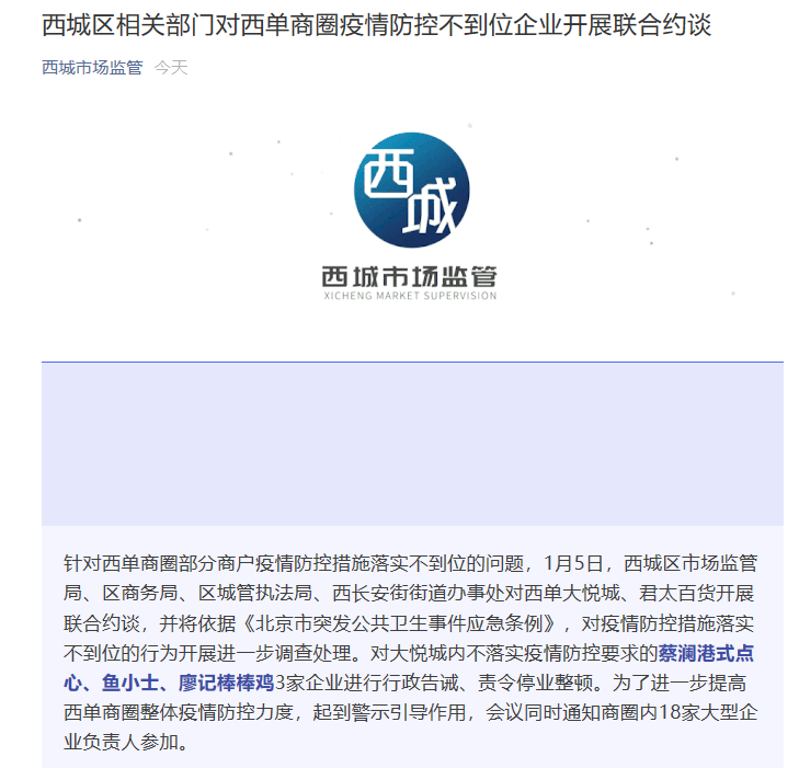 经济日报-中国经济网北京1月6日讯 据北京市西城区市场监管局微信公众号消息,针对西单商圈部分商户疫情防控措施落实不到位的问题,1月5日,北京市西城区市场监管局、区商务局、区城管执法局、西长安街街道办事处对西单大悦城、君太百货开展联合约谈,并将依据《北京市突发公共卫生事件应急条例》,对疫情防控措施落实不到位的行为开展进一步调查处理。对大悦城内不落实疫情防控要求的蔡澜港式点心、鱼小士、廖记棒棒鸡3家企业进行行政告诫、责令停业整顿。