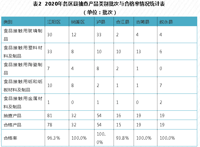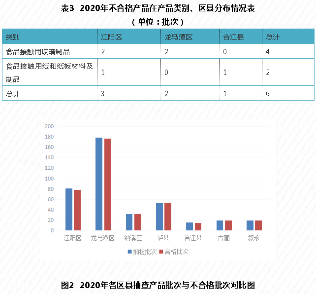 2020年食品相关产品市级产品质量监督抽查区域覆盖泸州市辖区内的江阳区、龙马潭区、纳溪区、泸县、合江县、古蔺县、叙永县。各区县的抽查产品类别批次、产品合格率情况见表2,不合格产品在产品类别、区县分布情况见表3,各区县抽查产品批次与不合格批次对比见图2。