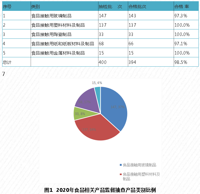 表1 2020年食品相关产品监督抽查产品类别批次与合格率统计表