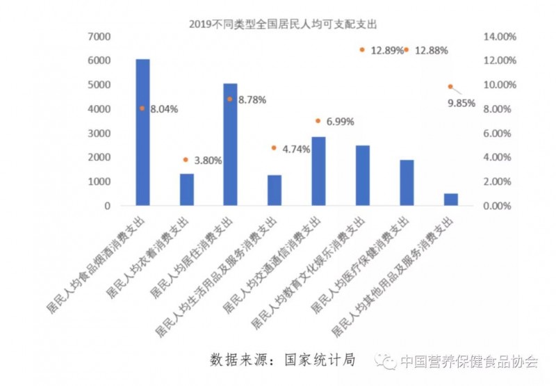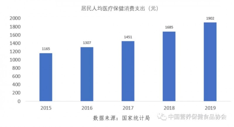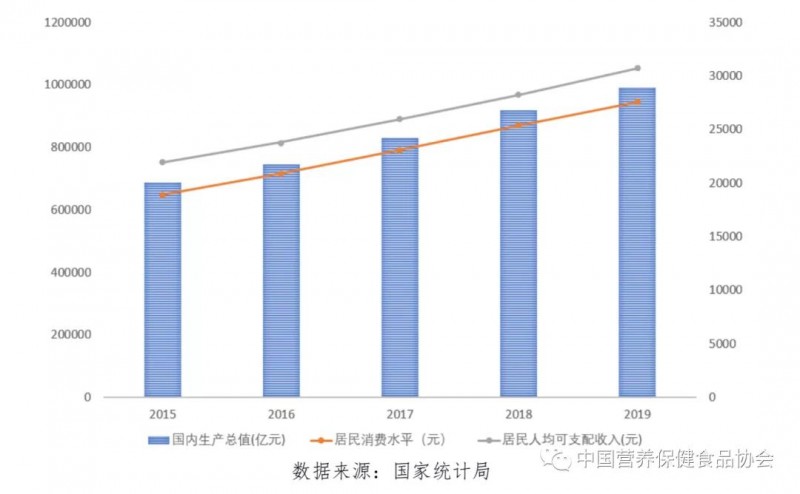 伴随着经济的飞速发展、新兴产业的崛起,我国国民生产总值逐年增加,2019年已达到990865.1亿元。居民人均可支配收入及居民消费水平也有显著提升,分别是30733元和27563元。与此同时,我们注意到2015-2019这5年里,居民在医疗保健上的消费也逐年增高,2019年的居民人均医疗保健消费支出是1902元,与去年相比增长了近13%。这一系列数据说明在国民生活水平提高的同时,居民更愿意为健康投资。特别是2020年新冠疫情的爆发,引发了一场空前规模的全民健康教育,广大消费者对于营养健康消费的认识,达到了一个新高度。