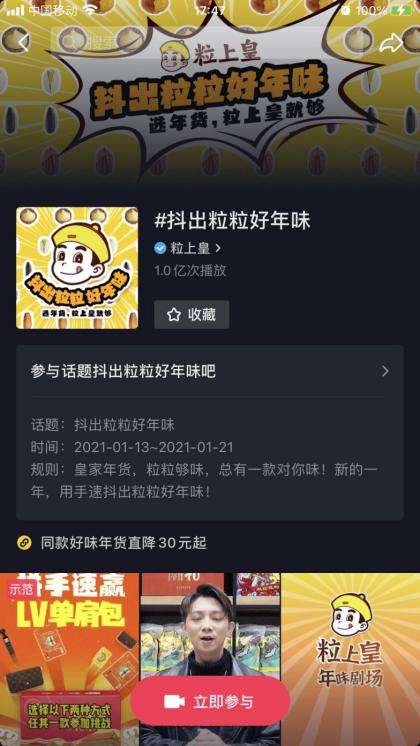 除了抖音,粒上皇还在快手、微信、微博等多个社交平台进行病毒式刷屏,把年货礼盒和粒上皇强关联一起,同时广派新年福利券,限时特优反馈全国栗粉,真正“洗脑”用户:有了粒上皇年货,这年味才粒粒够味。
