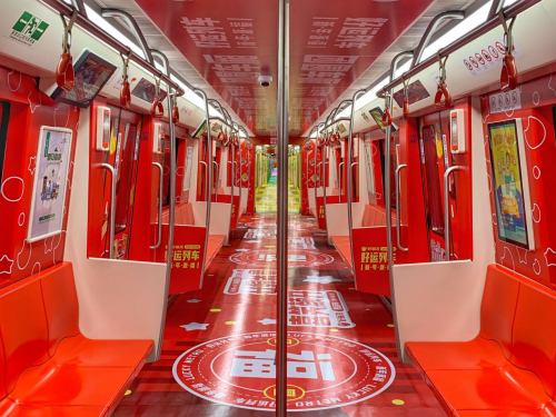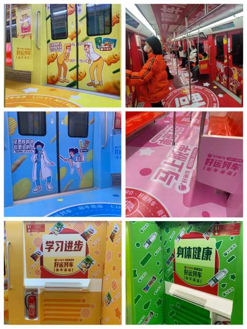 这是好丽友在哈尔滨地铁一号线包装的一趟“好运专列”。走进车厢,各式各样的美好祝福扑面而来。列车的六节车厢分别承载着六个好运主题:团圆喜乐,事业顺利,爱情甜蜜,身体健康,梦想成真以及学业进步。每一节列车的车门上都贴着“上头”的祝福语和表情夸张、动作魔性的搞笑画风手绘人物,车厢的顶部和底部也布满了喜庆的吉祥话,让乘客“低头踩福,抬头见喜”。而活泼的颜色让好运列车看起来特别“上相”,成为了新晋网红打卡处。不少乘坐地铁一号线出行的朋友进站前多了一个新期待:盼着能“偶遇”这趟好运列车。