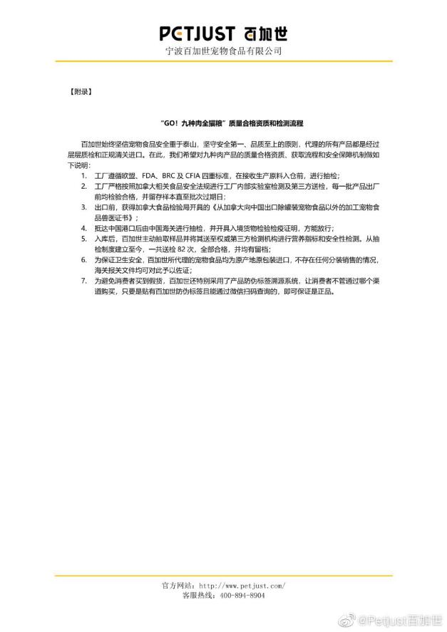 我们可以回过头来看看百加世的官方声明,产品进口自加拿大,在全球35个国家和地区均无质量问题,工厂严格遵循欧盟、FDA、BRC 及 CFIA 四重标准4项标准,出口前获得加拿大食品检验局开具的《从加拿大向中国出口除罐装宠物食品以外的加工宠物食品兽医证书》,入关后由中国海关进行抽检,并开具入境货物检验检疫证明。系列流程复杂严谨,还是比较真实可信的。